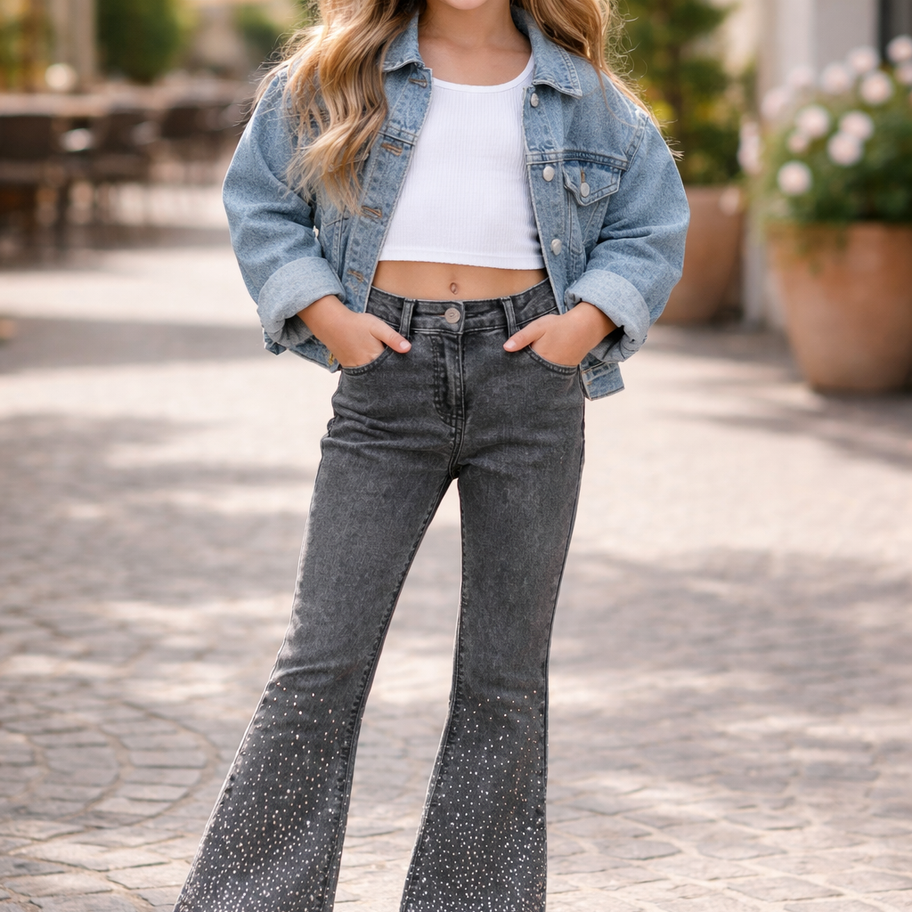 Coole und zugleich schicke Jeans für Mädchen in modernem, Schlaghosen Style. Die Hose präsentiert sich in einem edlen Grau Used mit angebrachten Glitzersteinchen am unteren Beinabschnitt und überzeugt durch ihren angesagten Look. Zwei Gesäßtaschen und zwei seitliche Eingriffstaschen machen sie alltagstauglich. Innen ist die Jeans im Bund verstellbar für eine optimale Passform. Ein Must-have für trendbewusste Girls – perfekt kombinierbar für Freizeit, Schick und Streetwear. NextBee-Store