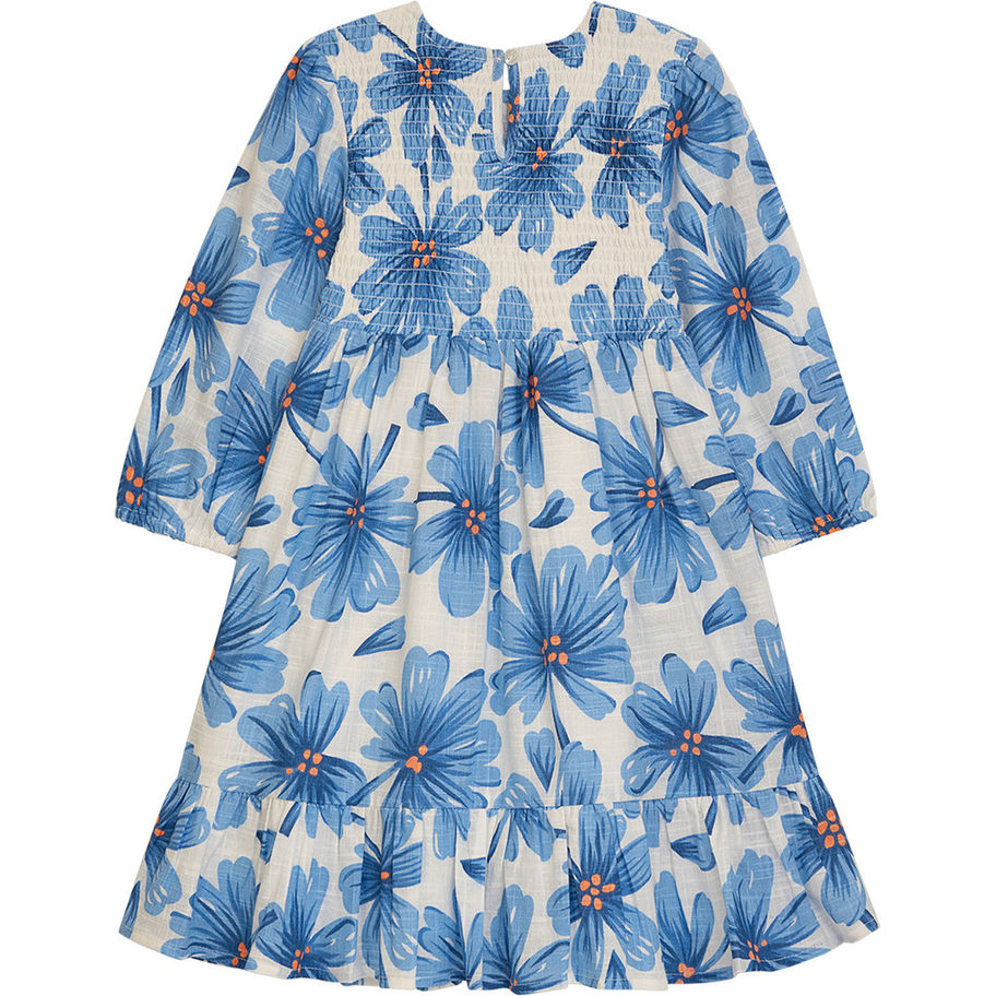 Muster: Großflächige, blaue Blumen auf weißem Hintergrund, mit kleinen orangefarbenen Akzenten in den Blütenmitten. Materialwirkung: Leicht und luftig, wirkt wie Baumwolle oder ein Baumwoll-Mix – ideal für Alltag und wärmere Tage.